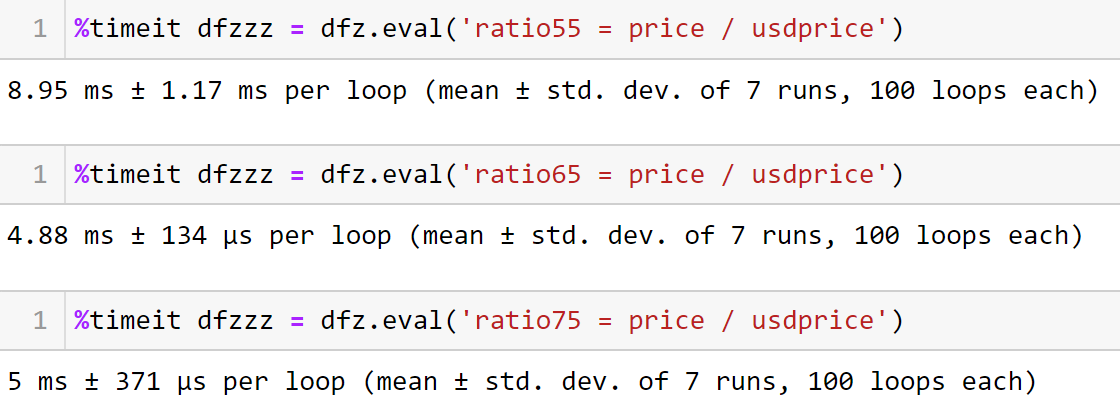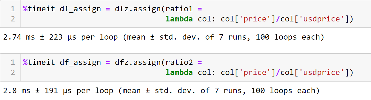 This method is even faster when compared to Eval. We can assign many columns in the existing data frame by using this function. You can see that Eval and Assign functions run 7*100 times by the timeit function. Both functions have approximately similar run times.