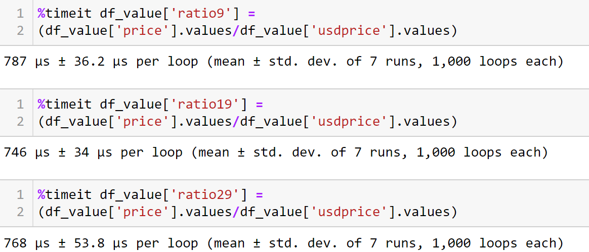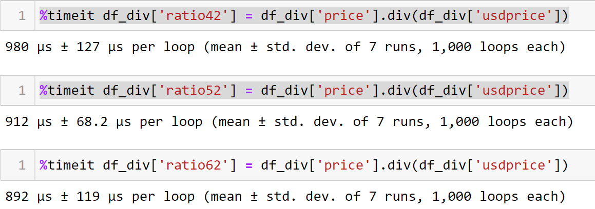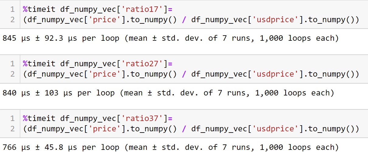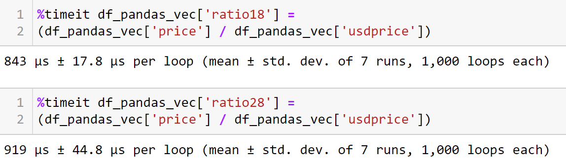 For numerical operations in a Pandas data frame with millions of rows, vectorization is the way to go. Especially for homogeneous operations, vectorization is very useful. In this case, the “price” and “USD price” columns have similar datatypes; hence, during vectorization, an array of price values and USD price values is created, and a division operation takes place simultaneously between the two arrays. So this method is more efficient and gives us faster results. The timeit function runs it 7 * 1000 times, as shown below.