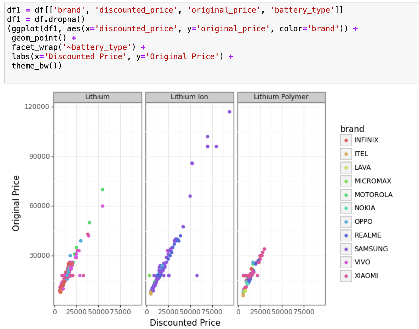 This code creates a scatter plot with discounted price on the x-axis and the original price on the y-axis, with the points coloured by brand. It also uses the facet_wrap function to create separate plots for each level of the battery_type variable.