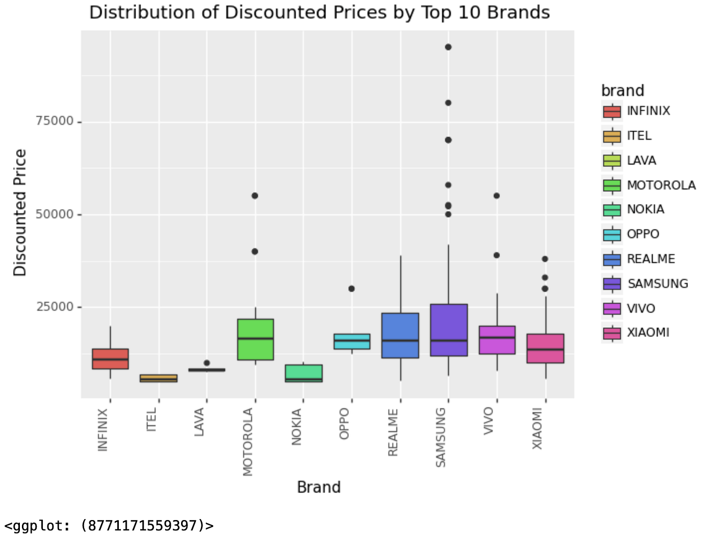 the ggplot function is called to create the plot. The aes function is used to map the brand variable to the x-axis and the discounted_price variable to the y-axis, and the fill argument is set to brand to fill the boxes with colours corresponding to each brand.