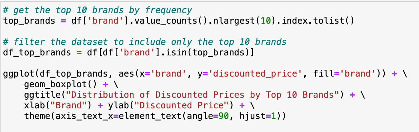 • ggplot(df, aes(x='original_price', y='discounted_price', color='brand')): The ggplot function initializes a new plot object, which is then customized with subsequent layers. The aes function maps variables to visual aesthetics. Here, original_price is mapped to the x-axis, discounted_price is mapped to the y-axis, and brand is mapped to colour.