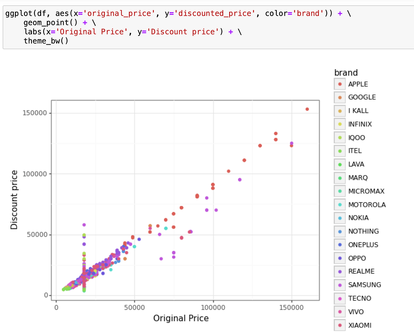 1. (ggplot(df1, aes(x='discounted_price', y='original_price', color='brand')) starts the plot, setting the x-axis to discounted_price, the y-axis to original_price, and the colour of the points based on brand.