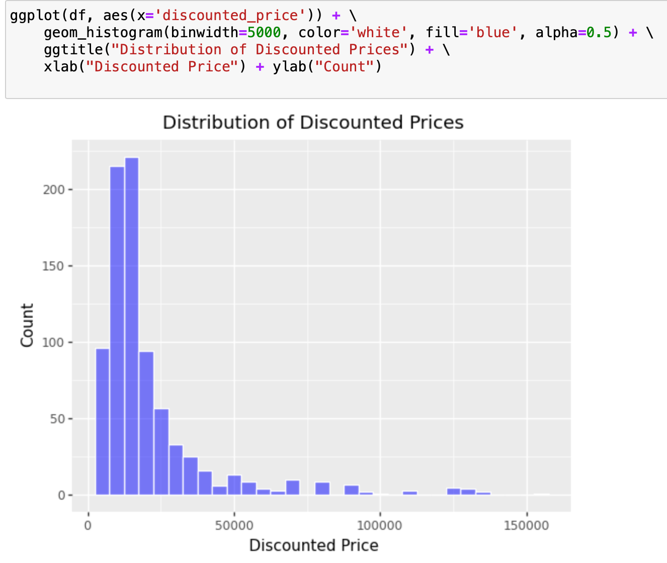 This code creates a histogram of the distribution of discounted prices in the dataframe df. The histogram bins are set to a width of 5000 using binwidth=5000. The histogram bars are filled with blue color and have white borders using color='white', fill='blue'. The transparency of the bars is set to 0.5 using alpha=0.5.