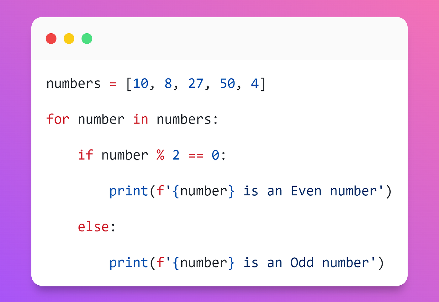Step 2: Next, the ‘numbers’ list was iterated using for loop, and the iterator variable was assigned as the number.