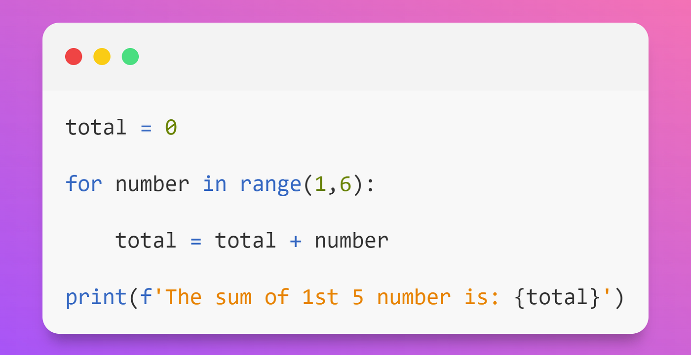 Step 1: Variable ‘total’ initialized to zero and range (1,6) were iterated over a loop. In this, the value starts from ‘1’ and ends at 5 (6 is not inclusive) and will be incremented by default ‘1’.