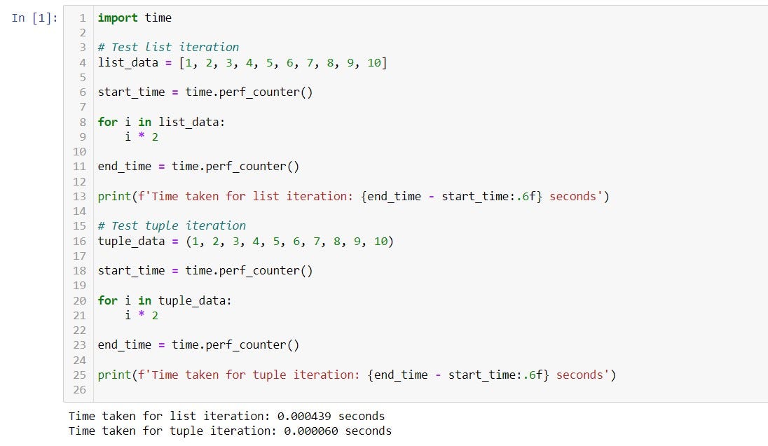 - List iteration time is slower and is time-consuming compared to the tuple.