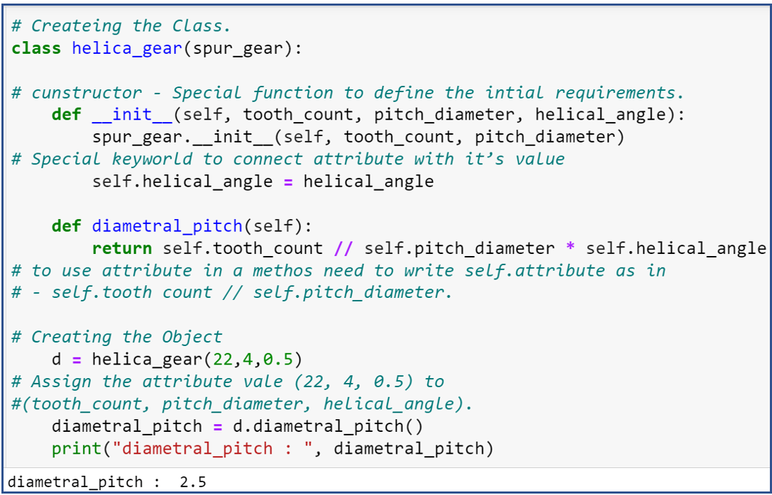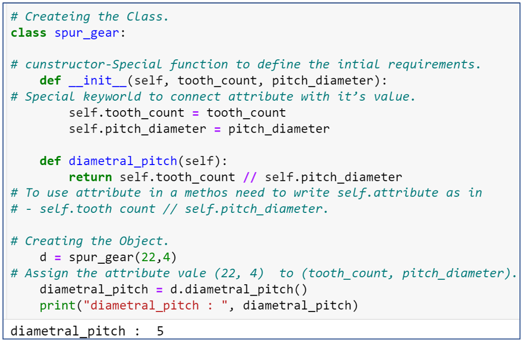 As per the code step1, we have created a Spur gear class- a basic template for different gears. Step2 needs to define the constructor – it is nothing but a particular function to describe an initial requirement using __init__, and to create any part inside a class needs to mention the self keyword to connect the attribute with its value. In step 3, we created an Object to assign the attribute value and then called the method to get the output.