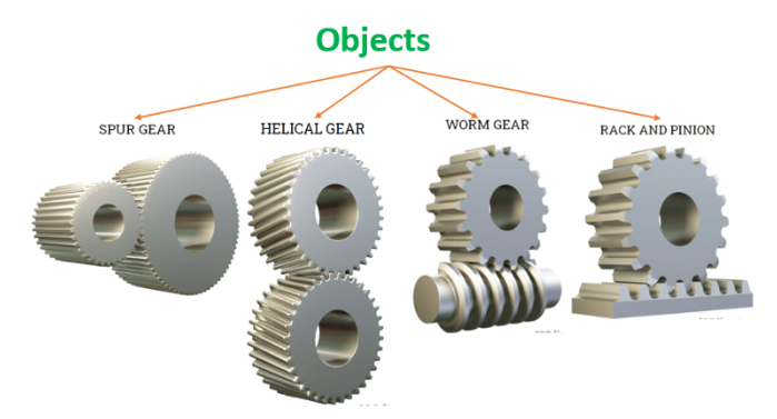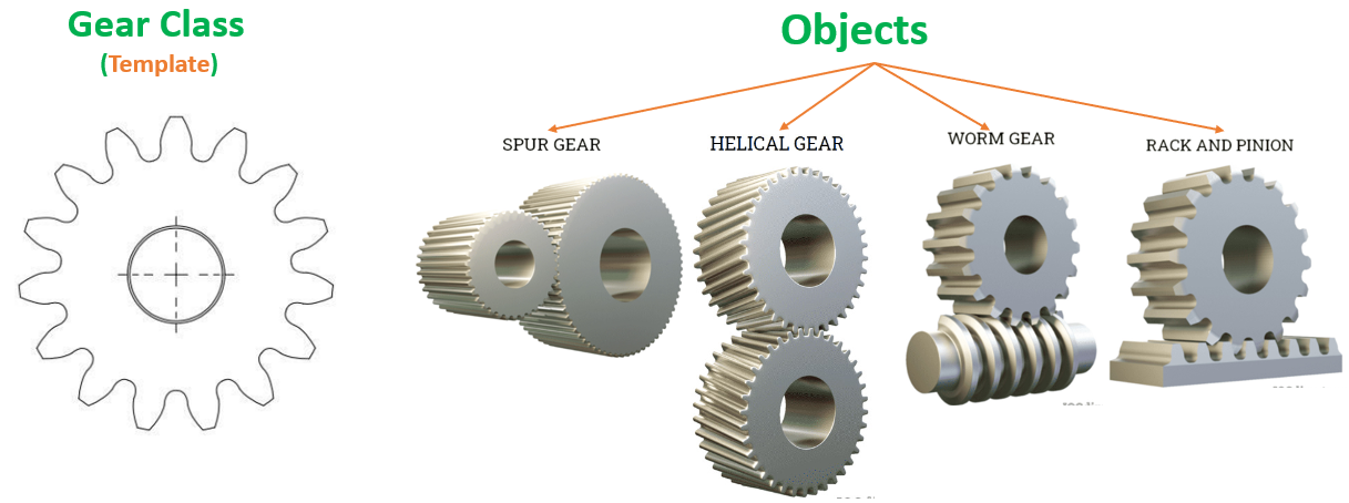 Object: Using the above template or blueprint of the Gear class, we can create any gear in real. Many companies make their bags — spur, helical, warm, rack, pinion, etc.- e, model, speed, but the values and brand can differ.