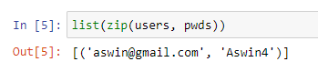 Once the user id and password are verified it stored the user id and password in a separate list (users and pwd) and zipped that the collected user id and password are stored in a tuple for every user.
