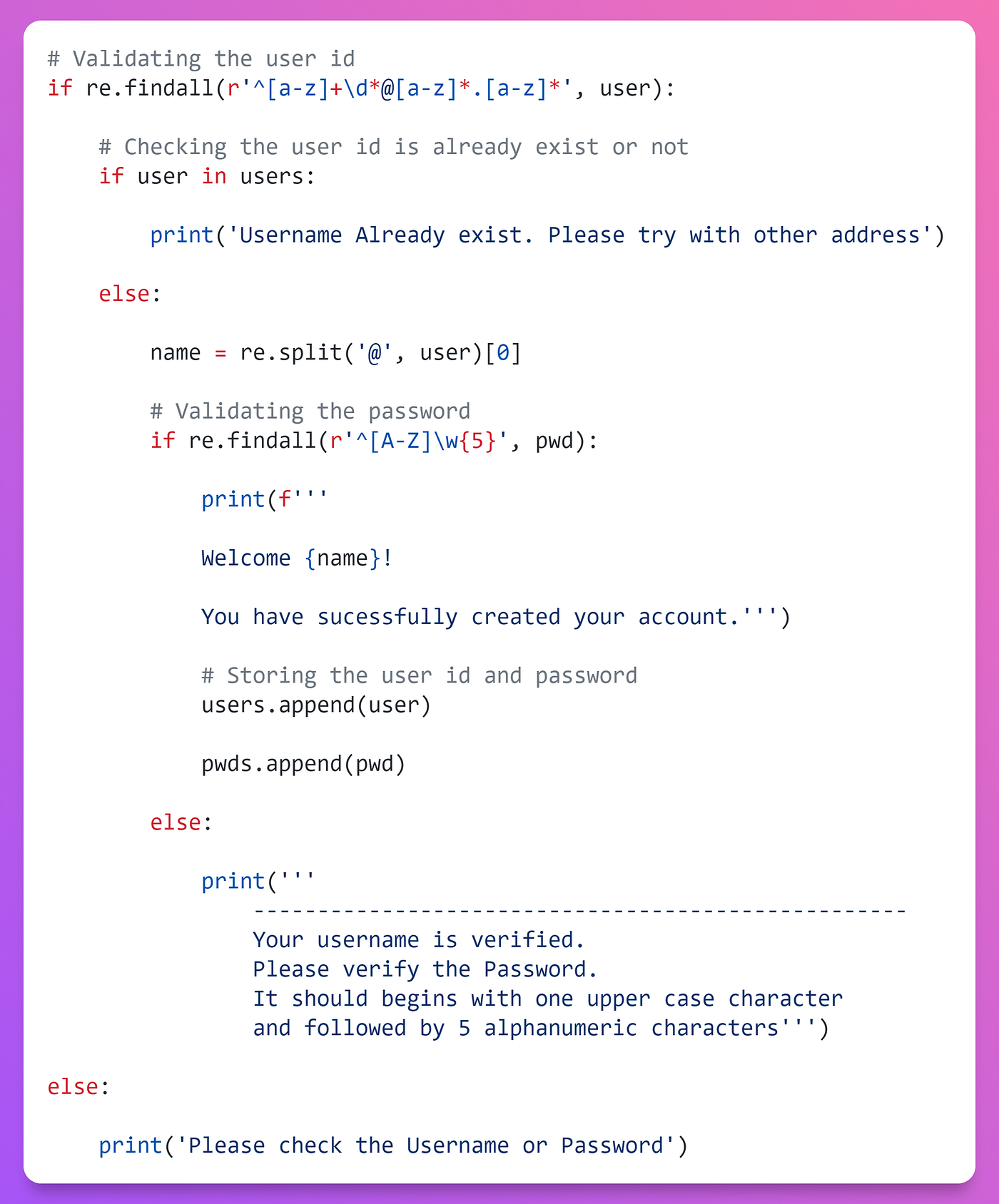 First, the user id is processed with the input using a search pattern (^[a-z]+\d*@[a-z]*.[a-z]*) and if the condition fails it will return as ‘Please check the Username or Password’.
